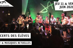 Jeudi 11 et vendredi 12 juin 2026 Horaires à venir Style : Jazz & Musiques actuelles Tarif : Entrée Libre CONCERT DES ÉLÈVES - JAM JAM DécouverteCONCERT DES ÉLÈVES PENDANT DEUX SOIRÉES : JEUDI 11 ET VENDREDI 12 JUIN 2026 Entrée Libre ! HORAIRES ET PROGRAMME À VENIR Les élèves …