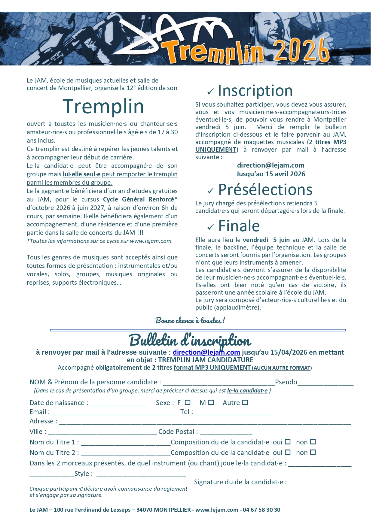 ↓ Toutes les informations concernant les modalités d’inscription au tremplin JAM 2026 ici ! ↓